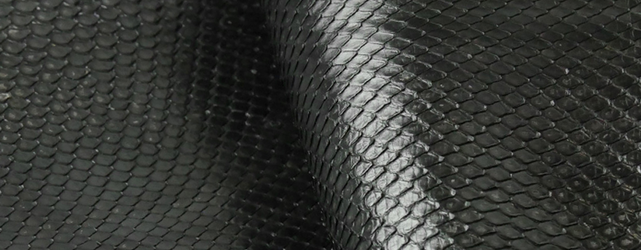 全身にダイヤ型の鱗があることからダイヤモンドパイソンとも呼ばれている、アミメニシキヘビ(Python reticulatus)を原料としています。ツルツルな鱗に覆われている様子は爬虫類の特徴の一つで、背中側には細かい鱗、お腹側には大きめの鱗が広がっています。部位による鱗の形状の違いから、皮革にする際には腹側から開くか(フロントカット)、背側から開くか(バックカット)で印象が大きく異なります。
