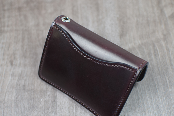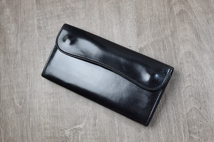 使用するとさらに鋭い光沢を帯びて、カラーによっては色の度合いが深まります。こちらの画像はスタッフが1年程度使用したシェルコードバンWAVE/ブラックです。光沢もさることながら、使い込むことで手に吸い付くような独特の質感に変化する部分も見逃せません。