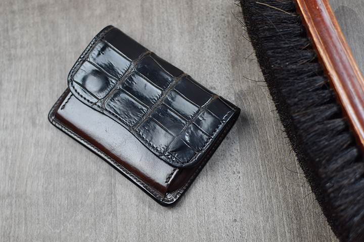 お手入れもシェルコードバンと共通する部分が多く、基本的なメンテナンスは、ブラッシングと柔らかい布を使用しての乾拭きです。クリームを使用する場合は、爬虫類専用のクリームをおすすめします。なお、どの皮革にも言えることではありますが、皮革用クリームの過剰塗布で逆に光沢が出にくくなるなど、皮革そのものの風合いが変化してしまう恐れがあります。