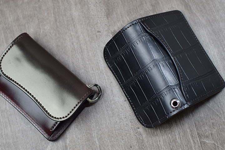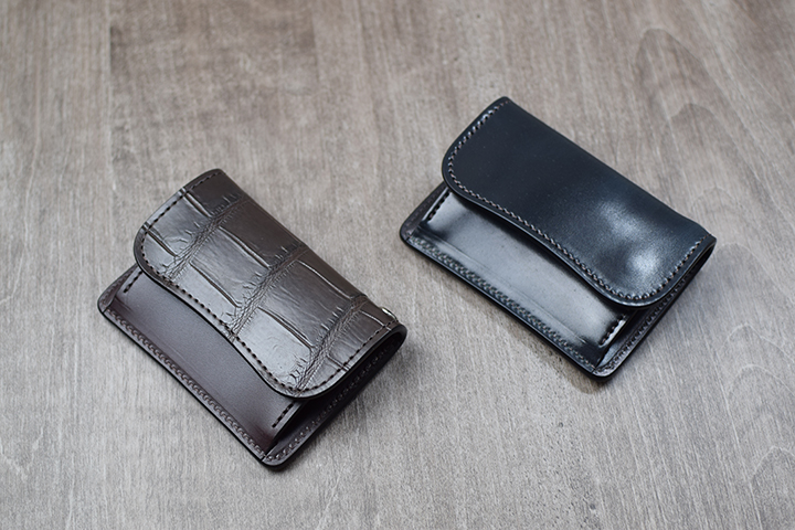 コインケースの前胴部分は、画像左のシェルコードバンでは同素材のシェルコードバンを用いていますが、画像右のクロコダイルではイングリッシュブライドルを組み合わせています。この部分は二つのバージョンにおける大きな違いとなります。使用前は少しマットなイングリッシュブライドルですが、使用していくと少しずつ光沢が現れます。