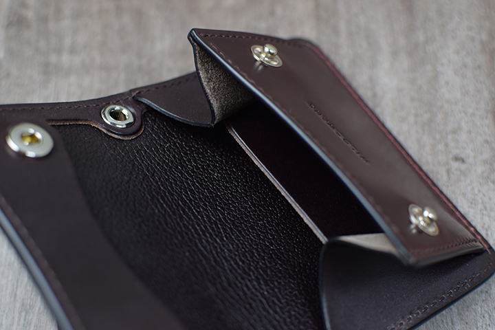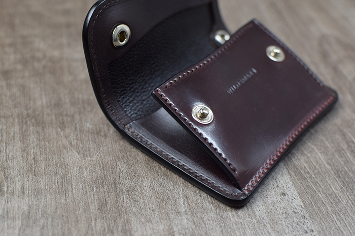 コインケース自体は、両マチ仕様で内部の収納量に応じて大きさが変動します。また、コインケースの前胴部分を手前に引くことで内部が見やすく、中身が取り出しやすい設計です。 なお、こちらのマチ裏については、クロコでは裏貼りが施されていますが、シェルコードバンでは裏貼りが無く、マチの表側に使用したイングリッシュブライドルレザーのトコ面(革の裏側)がそのまま現れる仕様となります。このため、トコ面にはイングリッシュブライドルレザーの染料が染み出した跡が残ることがありますが、こちらは皮革及び製品の特性となりますのでご了承ください。
