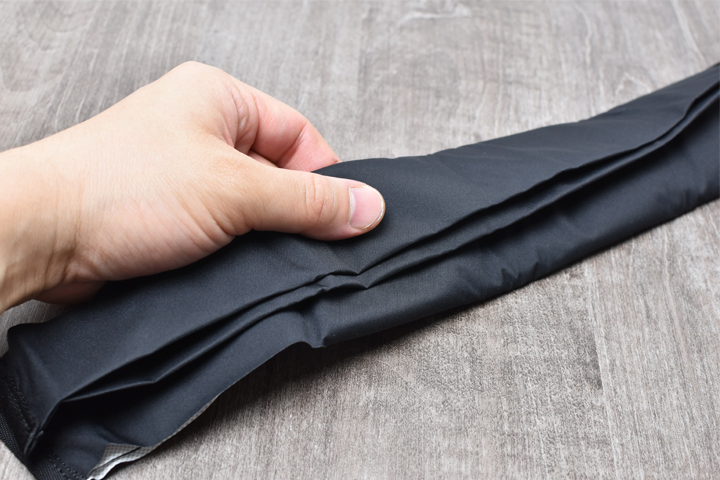 裏返してこのように縦に3つ折りに畳みます。折り畳む際には内装に設けられたポケットをガイドにして、ポケットに沿って折り畳むと綺麗に畳むことが出来ます。