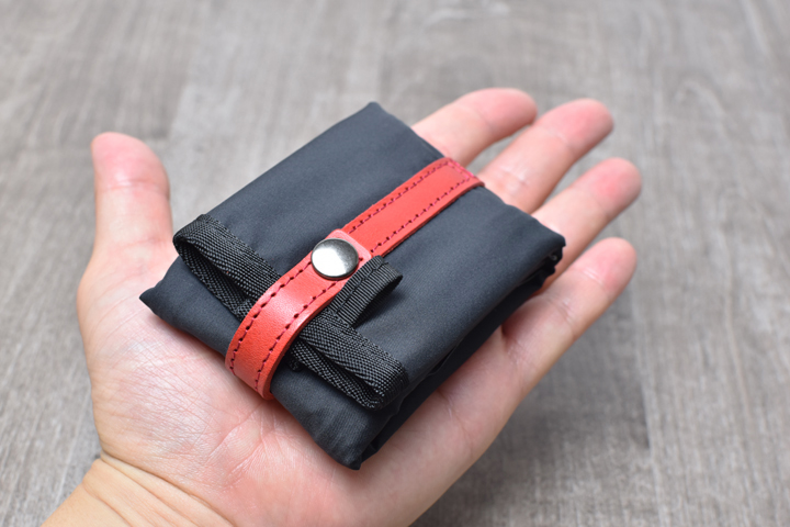 最後に本体底部分のホックに先ほど外したベルトの先端を留めることで折り畳みが完了します。
