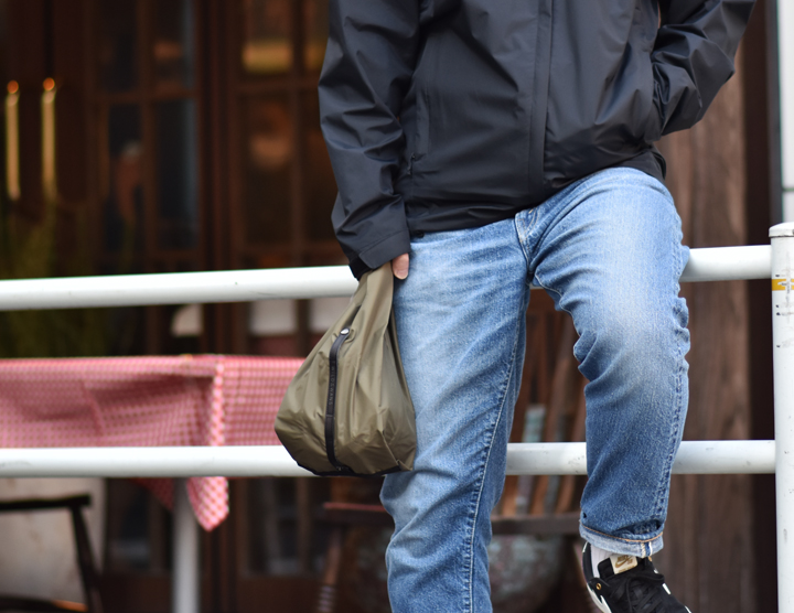 防水透湿性の生地を用いた、コンパクトに折り畳んで携帯できるエコバッグです。
