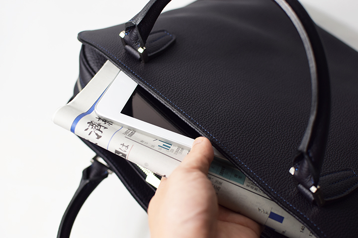 LANCELOTは、本体における表裏のデザインが同一です。内装のメイン収納部を覆うようなポケット収納部はマグネットボタンにより開閉する仕様です。直ぐに取り出したい書類や電子端末などの収納に便利なスペースです。