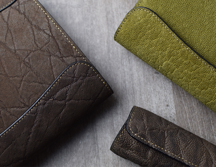 エレファントレザーは軽量で丈夫なことに加えて耐久性も高い皮革ですが、天然皮革であることや皮革そのものの特性上、ご注意とご理解を頂きたい点がございます。 まずシボやシワといった皮革表面の形状には個体差が大きく生じます。 また、皮革の製造工程で既に含まれる傷、シボのスレ、毛穴、色ムラといった点につきましても避けることは出来ません。 加えてこれはエレファントレザーならではの特徴ですが、皮革の部位によってはシワやシボが深く、また皮革の厚みが出る部分がございます。 こういった部分の縫製につきましては通常の製品と同様の縫製が出来ないため、他の皮革と比べてステッチのピッチ(間隔)が一定ではない、またはステッチのラインに乱れが生じることがございます。