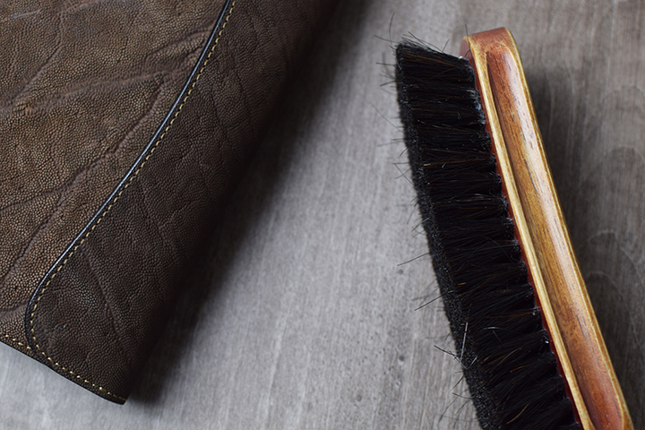 お手入れとしては、皮革に大きな問題がない限り、ブラッシングのみで完結します。一見すると手のかかりそうな皮革ですが、とても手軽にお使い頂けます。 今回ご用意させて頂いたエレファントレザーのカラーは次にご紹介する2色です。