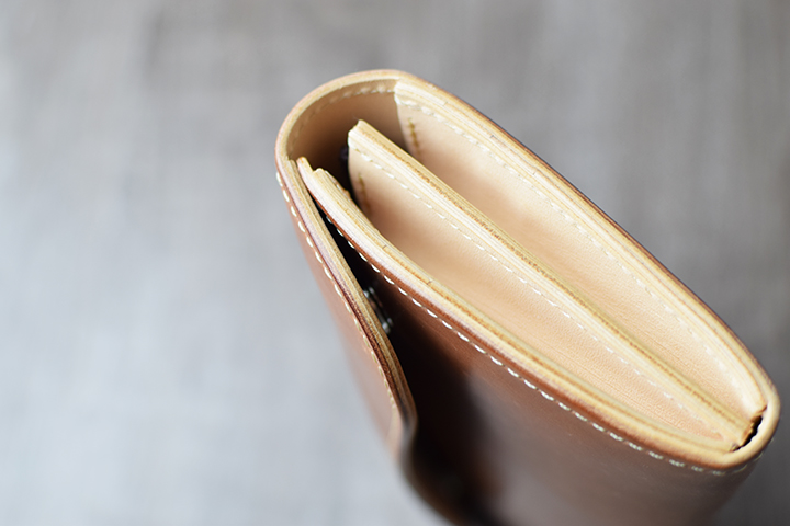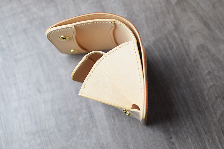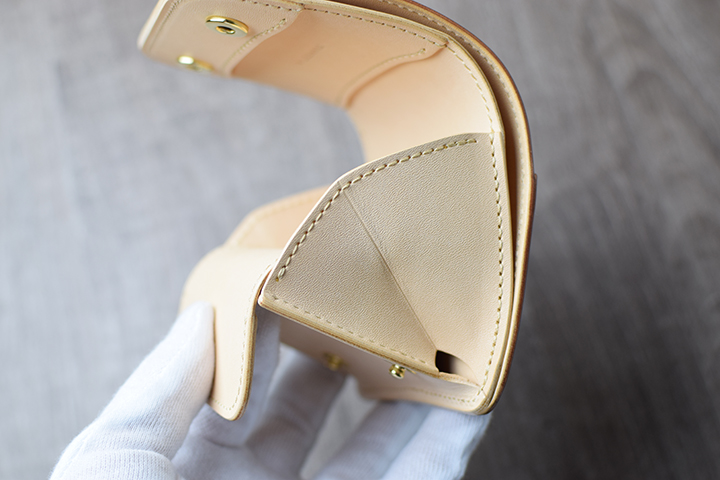 TONGUEと同じように、コインケースの両サイドにはマチがありますが、TONGUEと比べるとかなりマチに幅があります。上の画像では扇のように広がったCASAのマチを撮影しています。