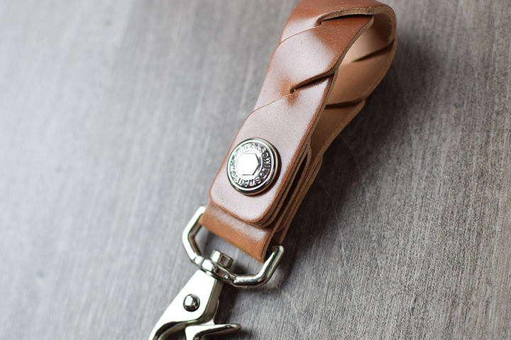 ホックの先にはナスカンと呼ばれる金属パーツがあります。最先端部にはレバーがあり、こちらを開閉することで、ベルトループや鞄のDカンなどに接続させます。こちらのナスカンはレバー部分との接続部分が動作に合わせてクルクルと回転する仕組みになっているため、金属やシェルコードバンの帯部分に負担が掛かりにくくなっています。