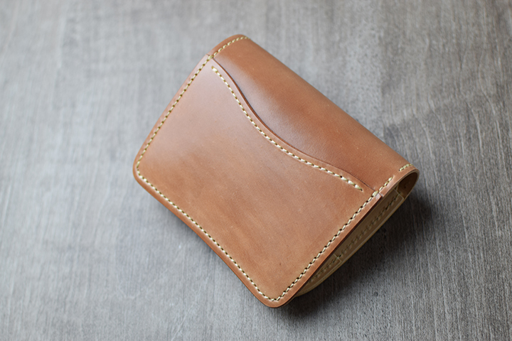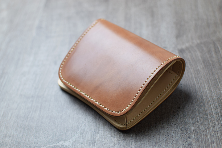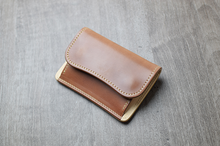 フラップ、背面、コインケースの前身にシェルコードバンのナチュラルを用いたTONGUEです。背面のカードポケットには非接触型のIC機能付きカードなどの収納がおすすめです。
