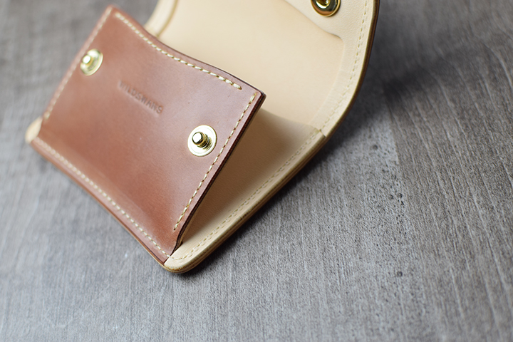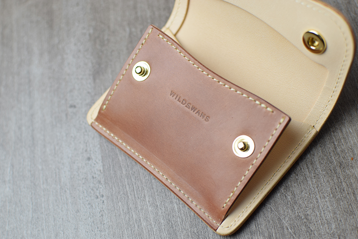 フラップを開くとコインケースの前身部分が現れます。中央にはWILDSWANSのブランドロゴが刻印されています。2種類のナチュラルカラーとゴールドカラーのホックが相まって上品なアンティーク感が漂います。