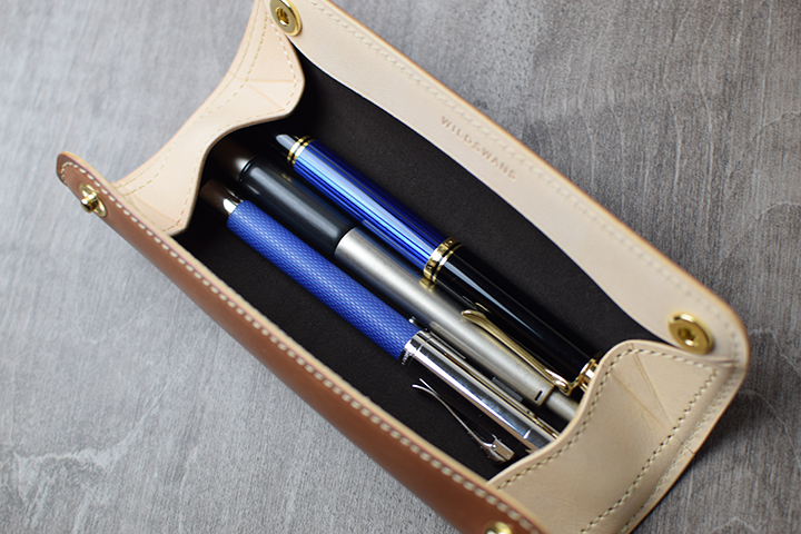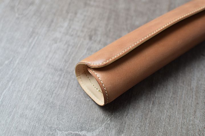 両サイドには収納したペンの落下を防ぐためのマチを設けています。ペン収納する際にはこちらのマチをペンに被せてフラップを閉じます。