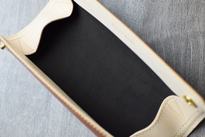 アイテム全体に統一感が生まれるように、内装部分にはサドルプルアップのナチュラルを組み合わせました。サドルプルアップはWILDSWANSがブランド創立当初から20年以上製作用いているベルギー・マシュア社の堅牢度の高い牛革です。しかし近年は、供給悪化の一途をたどっているため、WILDSWANSにおいてもサドルプルアップを用いたアイテムを製作することが少なくなっています。現在でもブラックやチョコのサドルプルアップアイテムはスポット的に登場する機会がありますが、ナチュラルカラーのサドルプルアップを目にすることは、とても珍しくなりました。今回内装に組み合わせたサドルプルアップのナチュラルは、シェルコードバンのナチュラル同様、エイジングの度合いの大きなカラーですが、シェルコードバンのナチュラル以上に濁りの無いピュアな表情です。