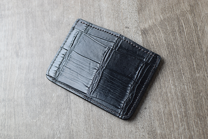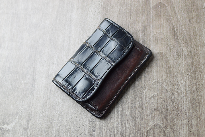 山なり部分の革は、型押しのイングリッシュブライドルレザーです。クロコの裏貼り部分は全てこちら皮革を組み合わせています。イングリッシュブライドルレザーはWILDSWANSではメイン素材としても用いられるコシが強く、耐久性の高い皮革ですが、クロコ部分の裏貼り革となることで、製品に抜群の安定感をもたらします。