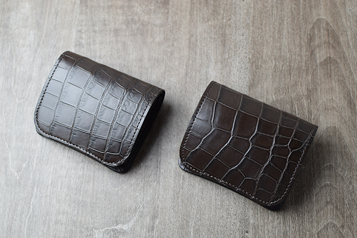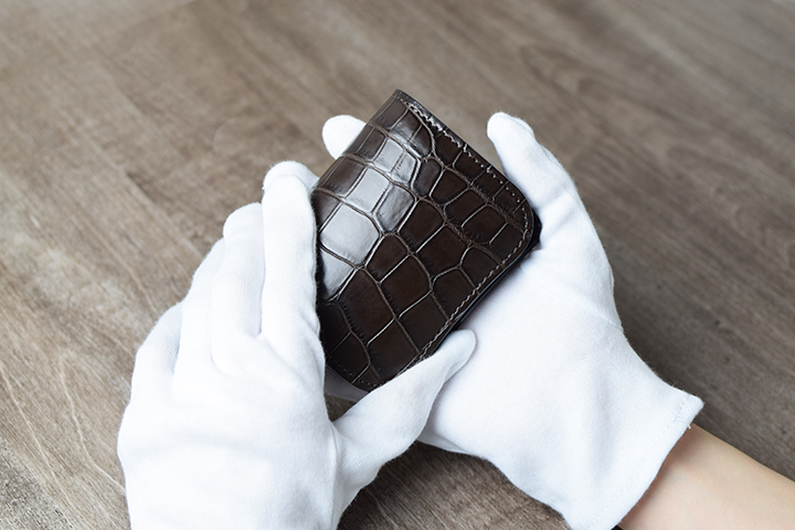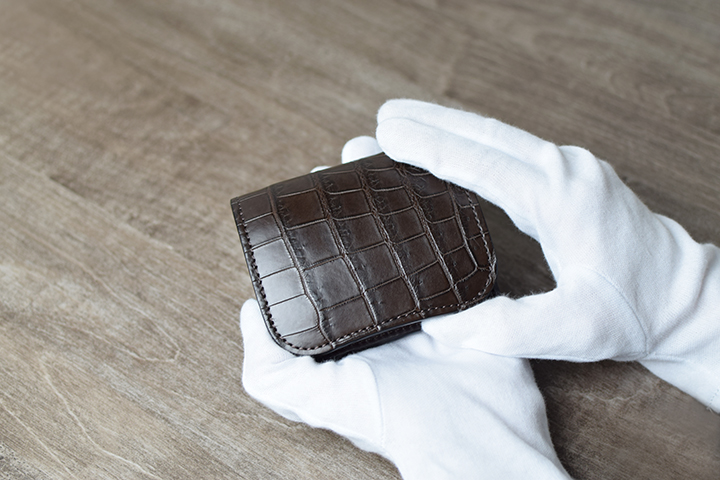 二つ目はクロコダイルです。天然のクロコダイルは、皮革表面に現れる斑柄が、一つ一つ異なります。こうした個性的な表情に加えて、高い耐久性も持ち合わせています。こちらの内装にもイングリッシュブライドルレザーを組み合わせています。皮革内部に豊富な油分を蓄えているため、使用すると皮革表面に重厚な艶が現れます。