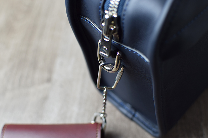 ちなみにこちらで使用しているTONGUE(EYELET)は、イングリッシュブライドルレザーのバーガンディのタイプです。フラップの片側にハトメ加工を施しているので、こちらにカラビナキーリング(S)を通して接続します。