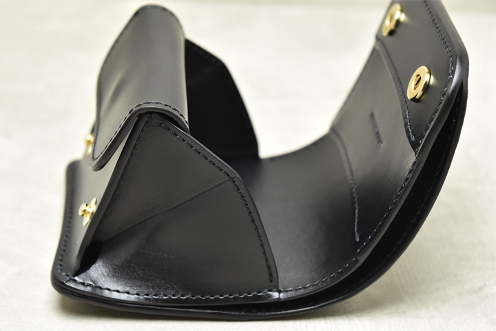 画像ではコインケースを横から見ています。 コインケースの両端のマチは大きく、60°近くまで開きます。 このマチの間をコインケースのフラップが移動し、そうすることでコインケースとカードケースの収納量が変化していきます。