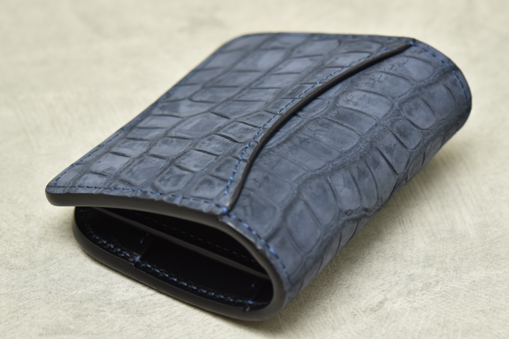 コインケースは左右にマチを備えており、手前に大きく開くことで硬貨の出し入れや中身の確認がしやすい構造になっています。 今回のヌバックポロサスTONGUEはコインケースの前胴部分やマチ部分もクロコダイルを使用しており、外から見える部分は全てヌバックポロサスを用いた贅沢な仕様になっています。