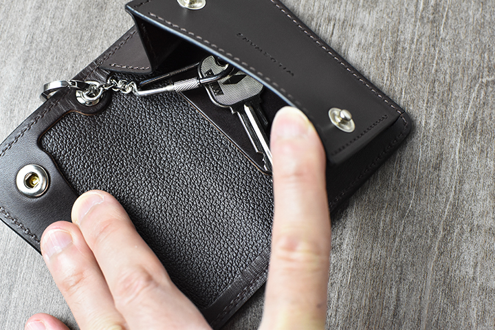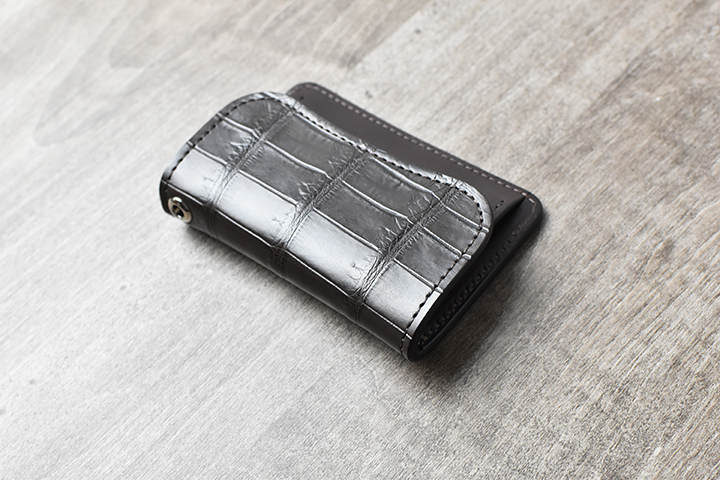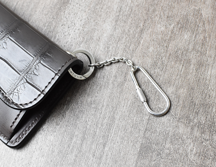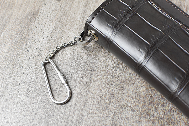 ちなみにこちらで使用しているTONGUE(EYELET)は、クロコダイルのチョコのタイプです。フラップの片側(画像では左側)にハトメ加工を施しているので、こちらにカラビナキーリング(S)を通して接続します。