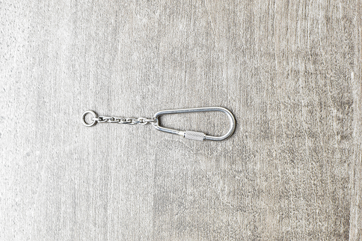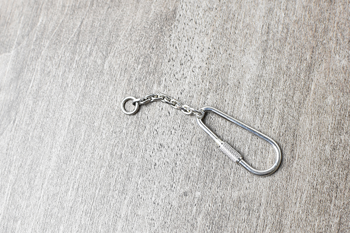 続いて、KEY CHAINとWILDSWANSのカラビナキーリング(S)を接続します。接続部分はKEY-CHAINの先端の小さなリングです。接続方法はカラビナキーリング(S)のレバーを開き、ここにKEY-CHAINの先端の小さなリングを通します。
