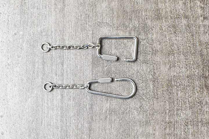今回のKEY-CHAINでも、前回と同じシルバー925を採用しています。シルバー925は純度の高く、強度にも優れた銀のことです。この証として、ネジ式カラビナ部分にはシルバー925の刻印が入ります。サイズが若干変わりましたが、ほぼ前回と同じサイズ感です。また、前回のものは海外からの輸入品で、発売から間もなく廃番となってしまったため、今回は国産でこちらに代わるKEY-CHAINのご用意が整いました。