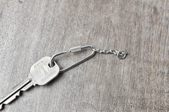 ここからは前回のKEY CHAINと同じようなご紹介ですが、改めて接続方法など詳しく見ていきましょう。まずKEY-CHAINとカギを接続しますが、この時カラビナのネジ部分を回して開きます。そして、開いたところにカギを装着します。