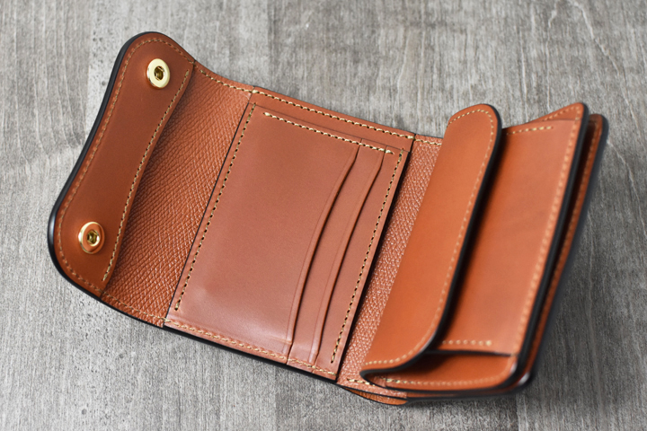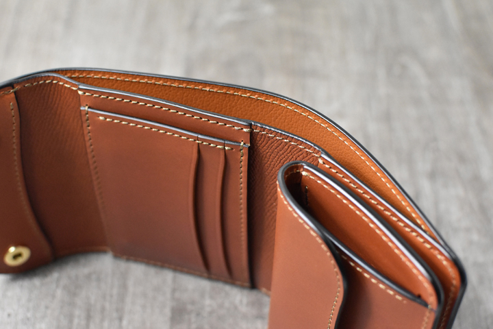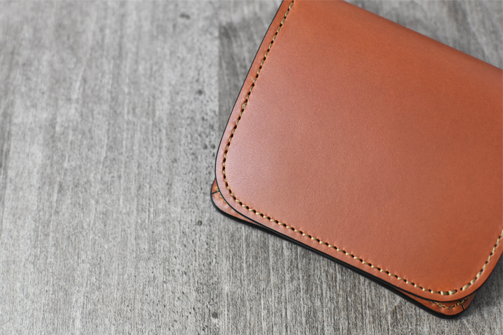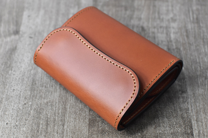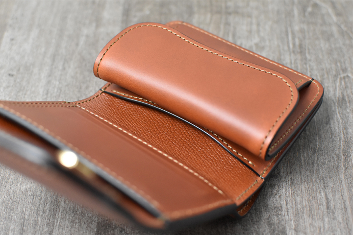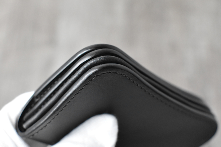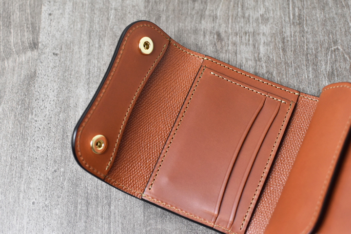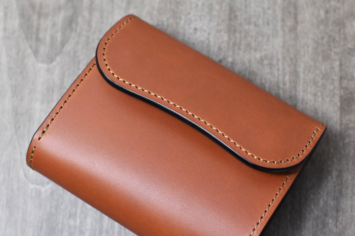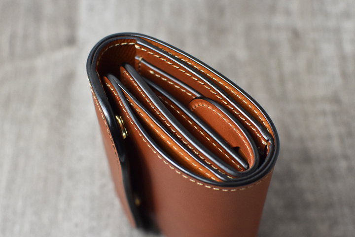 3つ折り財布のためパーツの重なりで厚みが出ますが、それゆえコバと革の貫禄を感じることが出来るモデルです。