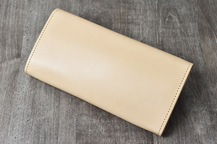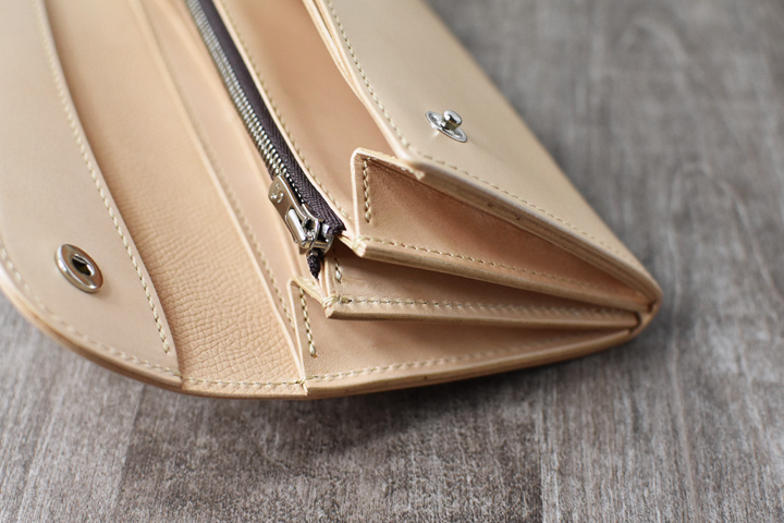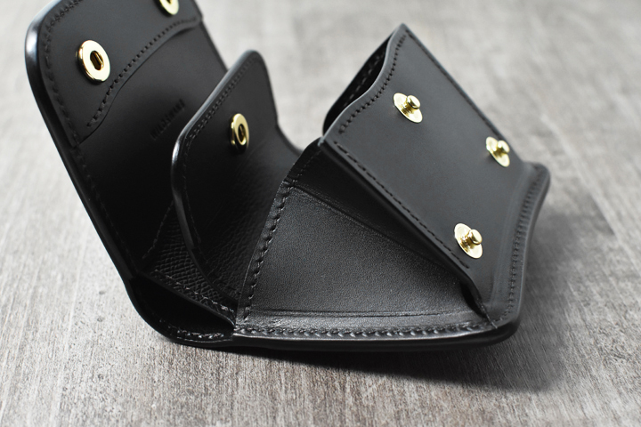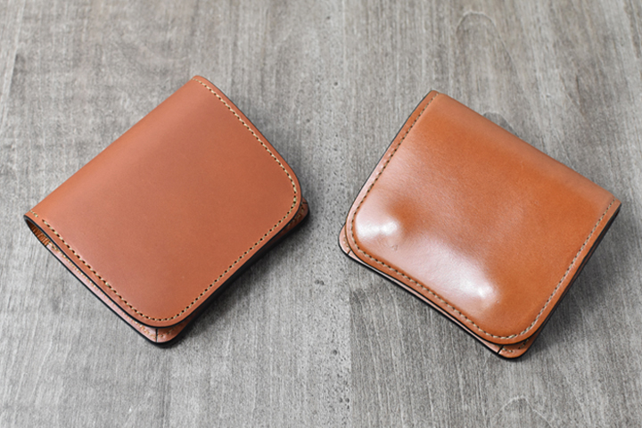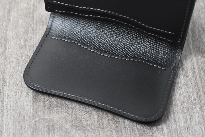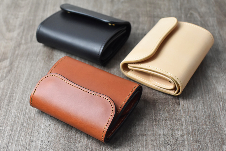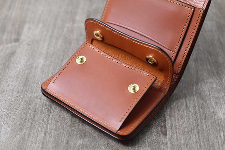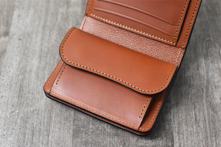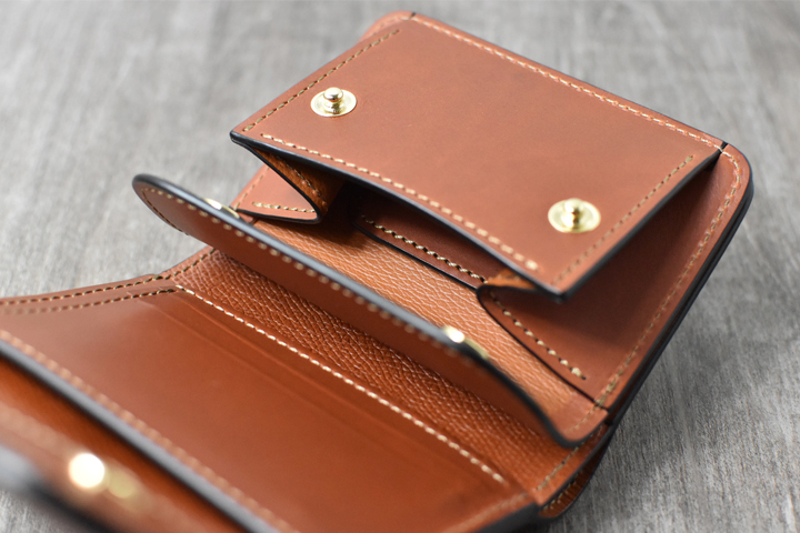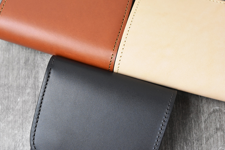 3つ折り財布のためパーツの重なりで厚みが出ますが、それゆえコバと革の貫禄を感じることが出来るモデルです。