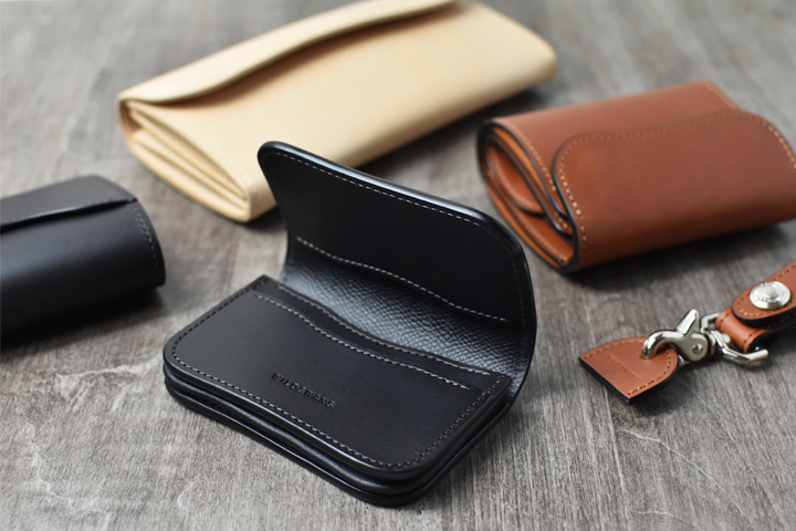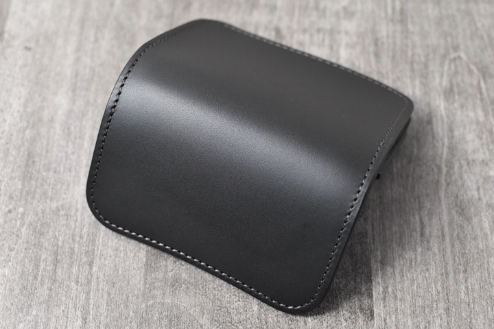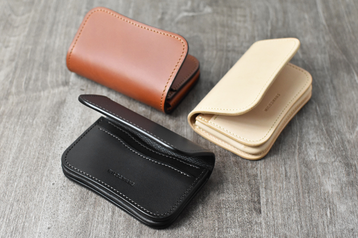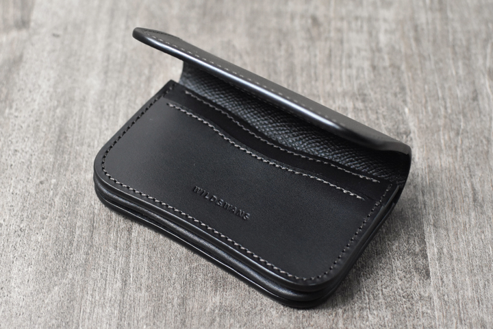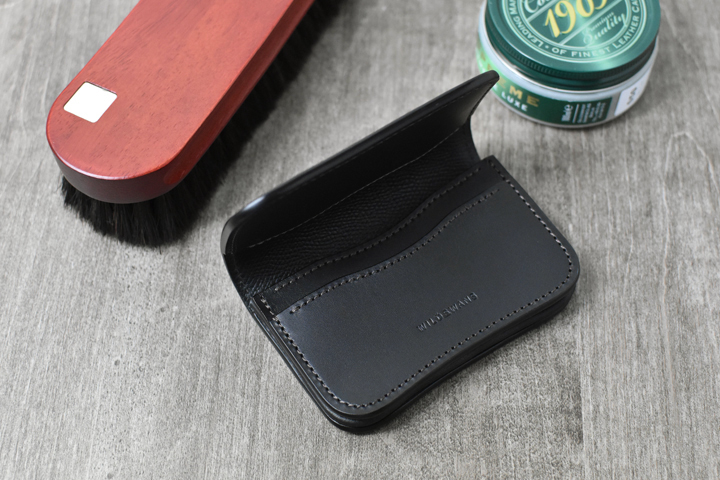 留め具が付属しない、流線形が特徴の名刺入れです。アーナルサドルの強いハリ感により、新品の状態ではフラップが勝手に開いてしまいますが、エイジングの進行と共に自然とフラップが閉じていく過程をお楽しみください。