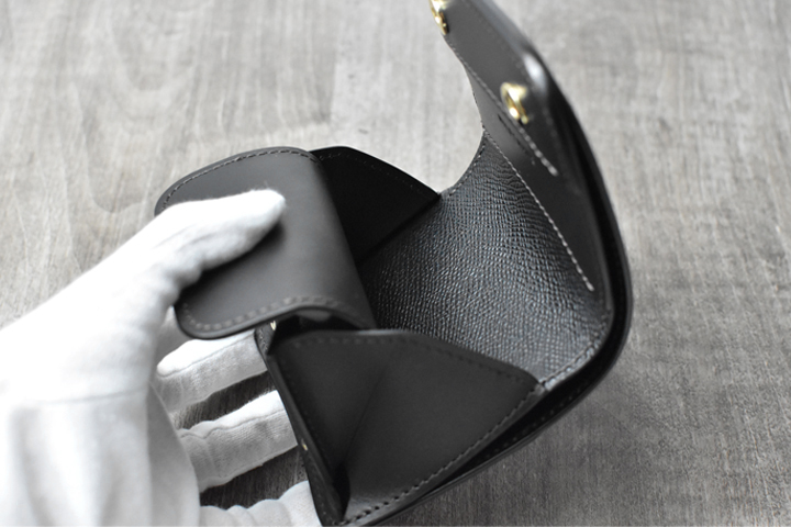 また、コインケースのフラップは底辺のみが固定された構造のため、前胴に添うように手前に開くことが出来ます。こちらのフラップの裏側にはカード類をまとめて収納することが出来ます。最大7枚ほどのカードの収納が可能ですが、収納するカードの量に合わせてフラップが可動しますので、すっきりと収納することが出来ます。