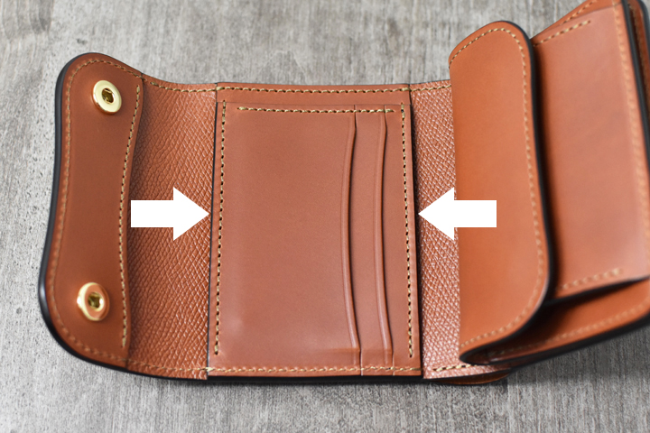 縦幅をしっかりと取り、口元もカーブを描いているので、コインケースが手前にありながらも問題なくカードの出し入れが可能です。
