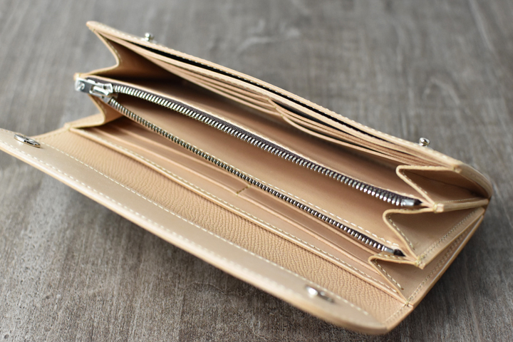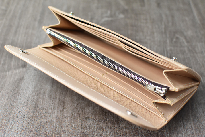 内装の構造は、大部屋が2室、マチ無しポケットが2室、カードポケットが12室、ファスナー付きコインケースが1室用意されています。