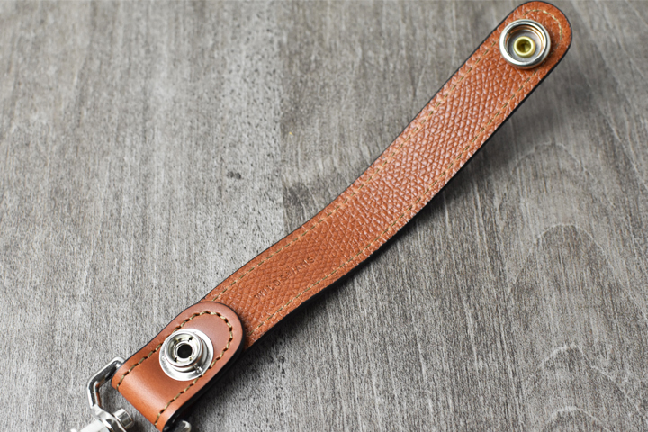 本体の帯は1本のパーツから成り、ジャンパーホック7050と呼ばれる頑丈なホックにより留められています。こちらはWILDSWANSのトートバックDRUCKERにも用いられるほど強度の強いホックですので、ホックが勝手に外れて鍵が落ちてしまうようなことは起こりません。