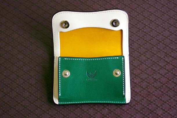 フラップを開けるとサドルのナチュラルが鮮やかなグリーンがとても引き立てます。