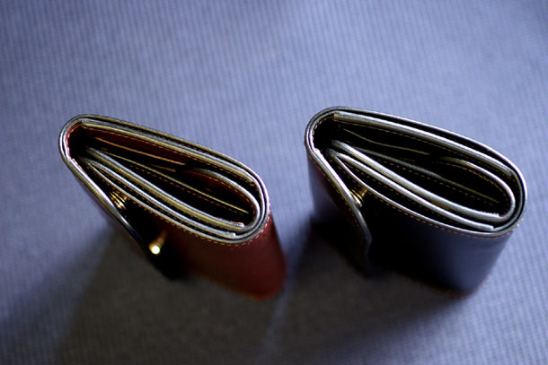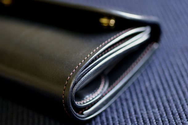WILDSWANSの革小物の中では比較的珍しい3つ折りタイプですが、ピカピカに磨かれた重層的なコバは健在で、ゴロンとした革の塊のような充実感を感じることが出来ます。