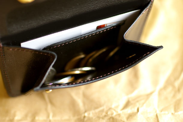 内側には可動する仕切りが付いていますので、例えば手前にコイン、仕切りの後ろ側にポイントカードやクーポン券などを入れられますので、使い方の幅が広がりますね。