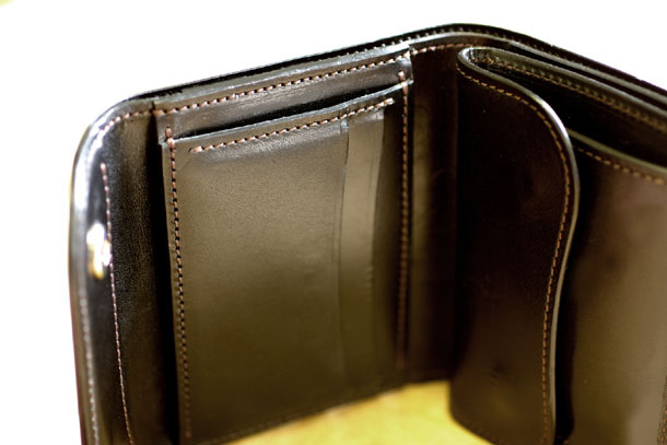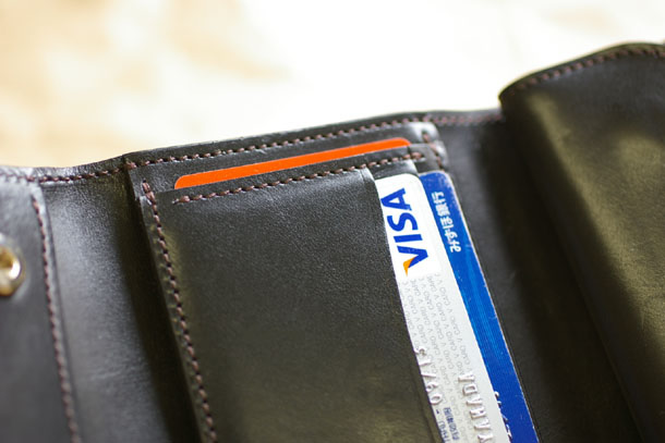 フラップを外しお財布を開くと中央にカード段、右側にコイン室があります。カード段は縦方向に1段と横方向に2段の合計3つで、大変シンプルな設計です。