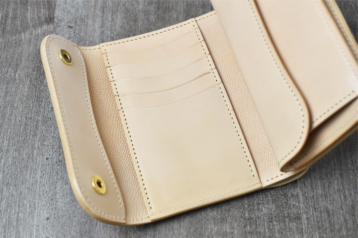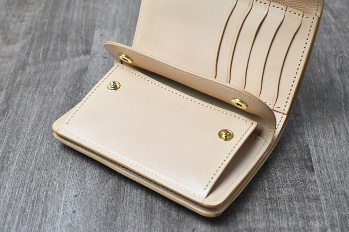 こちらのコインケース内には「ベロ」と呼ばれる仕切りを設けていますので、コインとカード、折りたたんだ紙幣などを仕分けて入れていただくことができます。