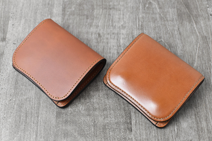 こちらが使用前(画像左)と使用後(画像右)の比較画像です。使い込むことにより、美しい艶感が革表面を覆っています。パーツの重なる部分やバネホックの部分が凹凸となって現れ、アイテムとしての迫力が増して見えます。