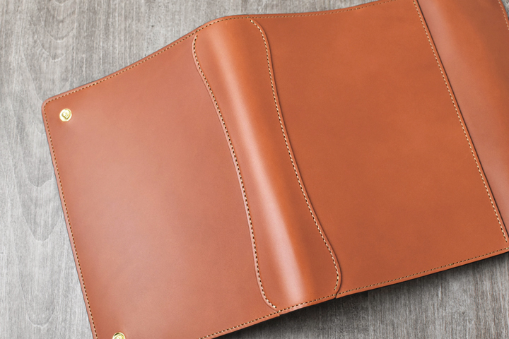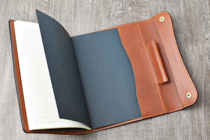 フラップを開けると長めに設けられたペンホルダーが現れます。こちらのペンホルダーにはペリカンの万年筆400番程度の太さのペンを収めることが出来ますので、是非お気に入りのペンを挿してお使い下さい。