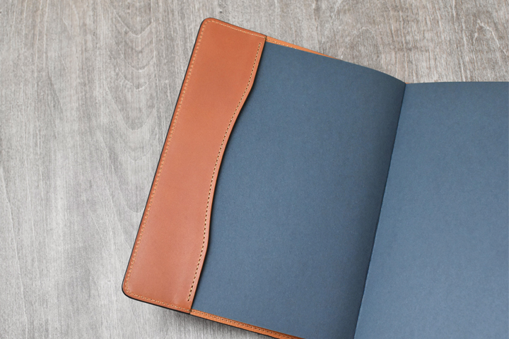 ホック付きのフラップで留めることによりノートを堅牢に守り、持ち運びにも対応した仕様です。