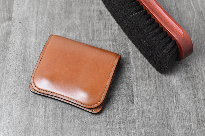 フランス・アーナル社の製造するサドルレザーは、馬具用に造られた堅牢で耐久性の高い皮革です。その特徴はお財布などの小物になっても健在で、手にした時のハリ感やコシ感からは繊維密度の高さが伺えます。硬く、弾力の強い質感はタンニンなめし革ならではのものです。