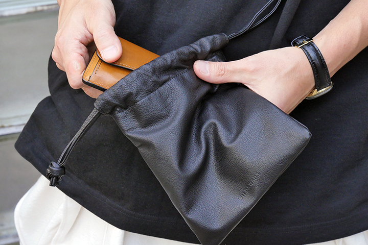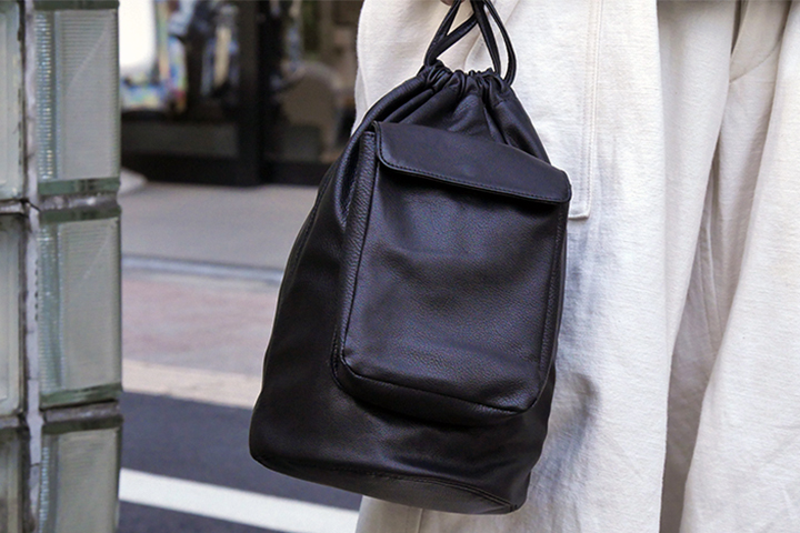 メイン素材にアノネイ社のラスティ―カーフを贅沢に使用した<ドローストリングバッグ>の先行予約販売を