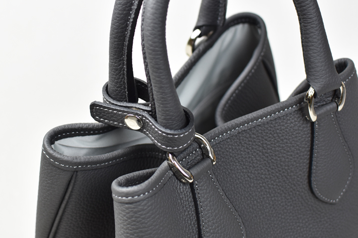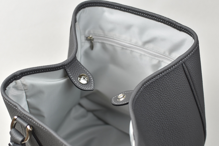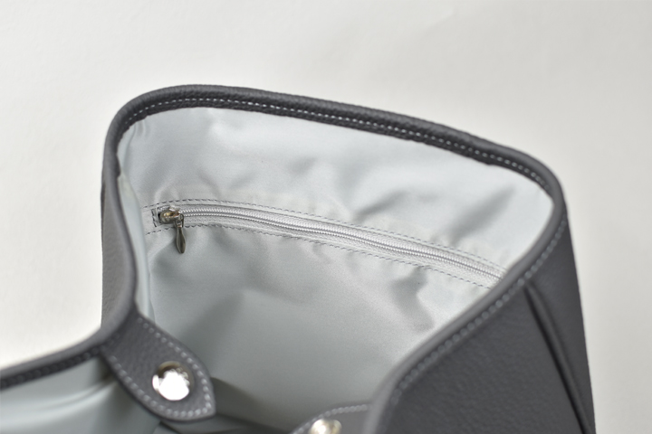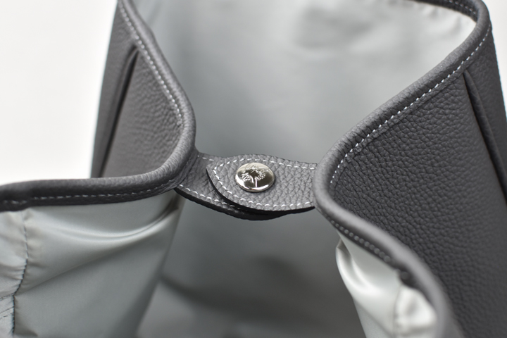 サイドのマチはジャンパーホック付きのパーツによって内側に畳まれ、プティトートの特徴的なフォルムを生み出します。
