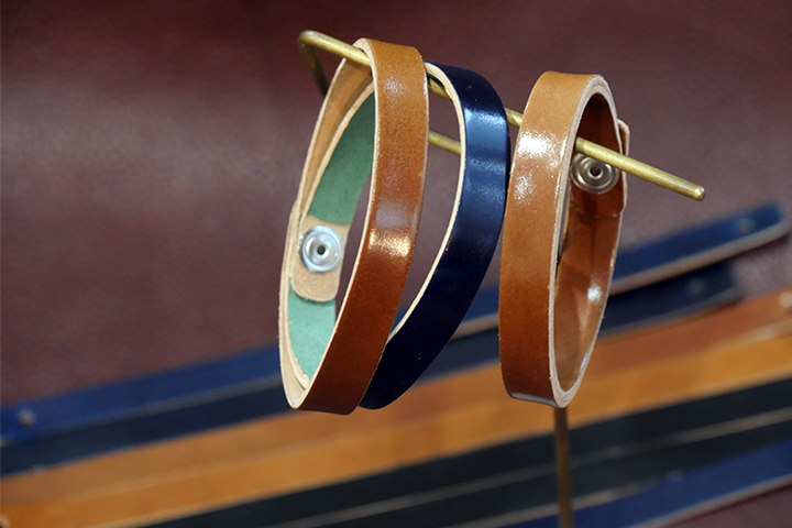 2重レザーブレス同様に革はホーウィン社のシェルコードバン(こちらはブラック、#8、#2、バーボン、ダークコニャック、ネイビー、グリーンの7色)でご用意させて頂きました。