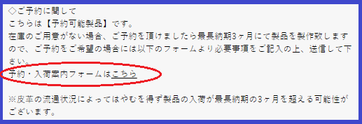 【入荷案内可能製品】に関しましては生産が不定期なことから納期の設定が困難なため製品が入荷次第ご連絡をさせて頂きます。