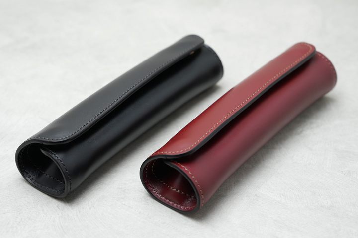 筒状に丸めた皮革で筆記用具を包み込むように収納するペンケースです。 小型ですが収納量もしっかりと確保され、操作もシンプルで使い勝手の良いモデルです。