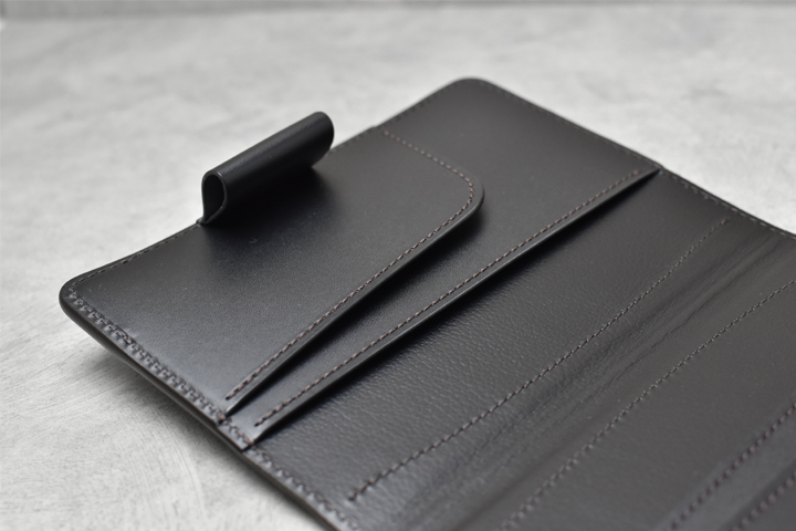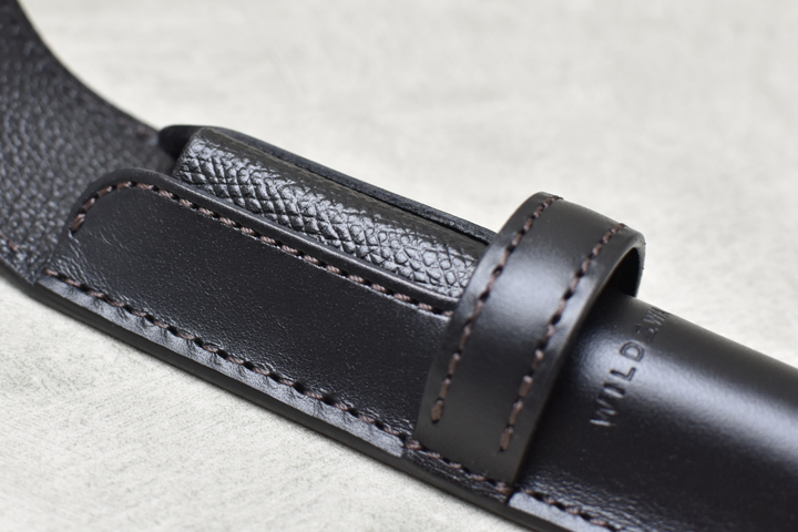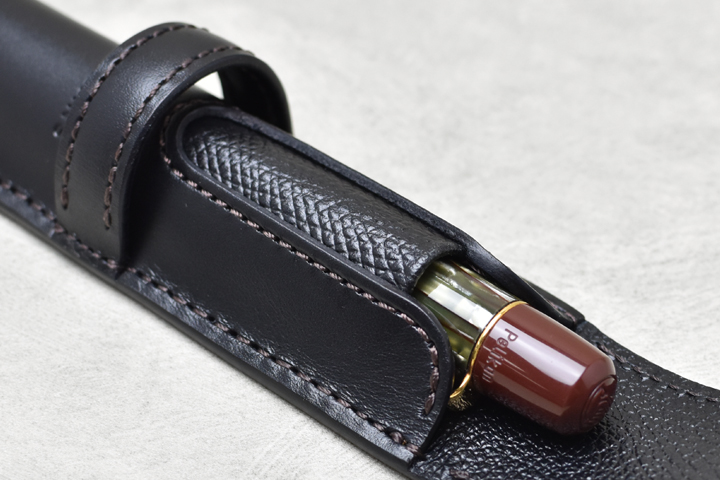 スペースは太軸のペンにも対応できるよう余裕を持った構造で、PELIKANのスーベレーン1000番などのペンも収納可能です。 内装のペンクリップが当たる部分には摩擦に強い型押しの皮革を使用しています。