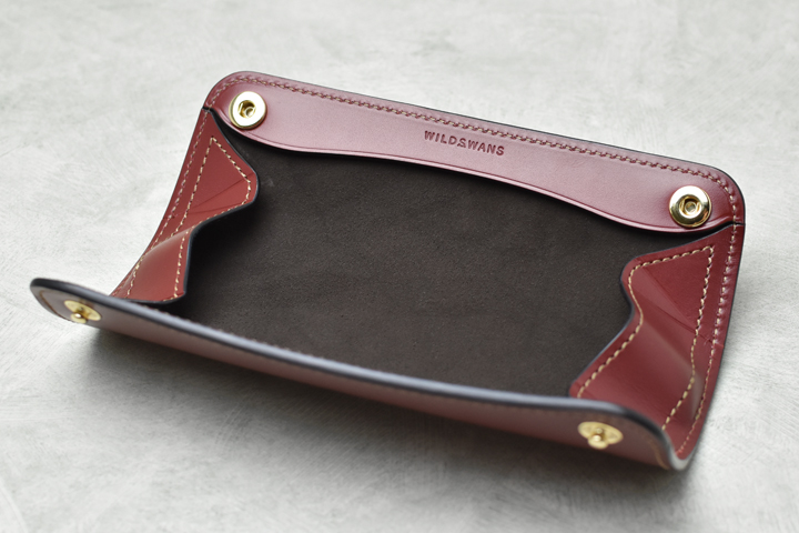 ホックを外すと本体は一枚の革のように大きく広がります。 この状態でデスク上ではペントレイとしてご使用頂くことも出来ます。