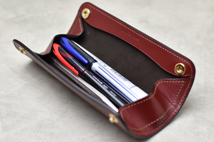 両サイドは皮革の張りによって内側へ入ろうとする力が加わり、ペンの収納時にケース内のぐらつきを抑え、支えるような仕組みになっています。